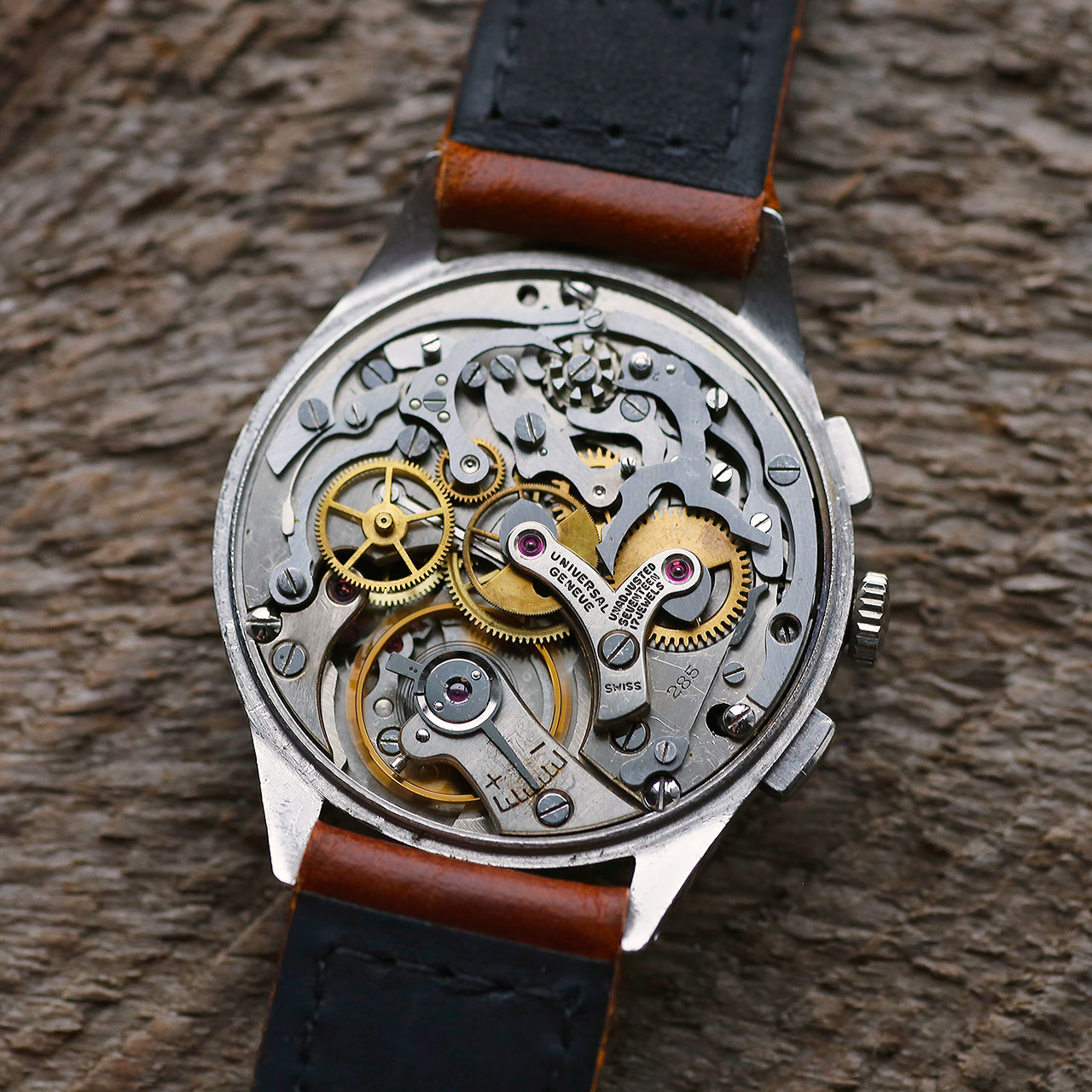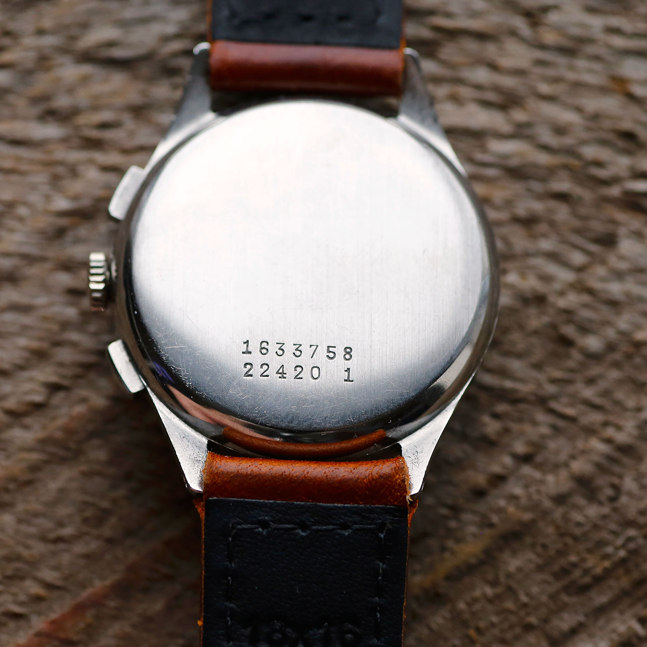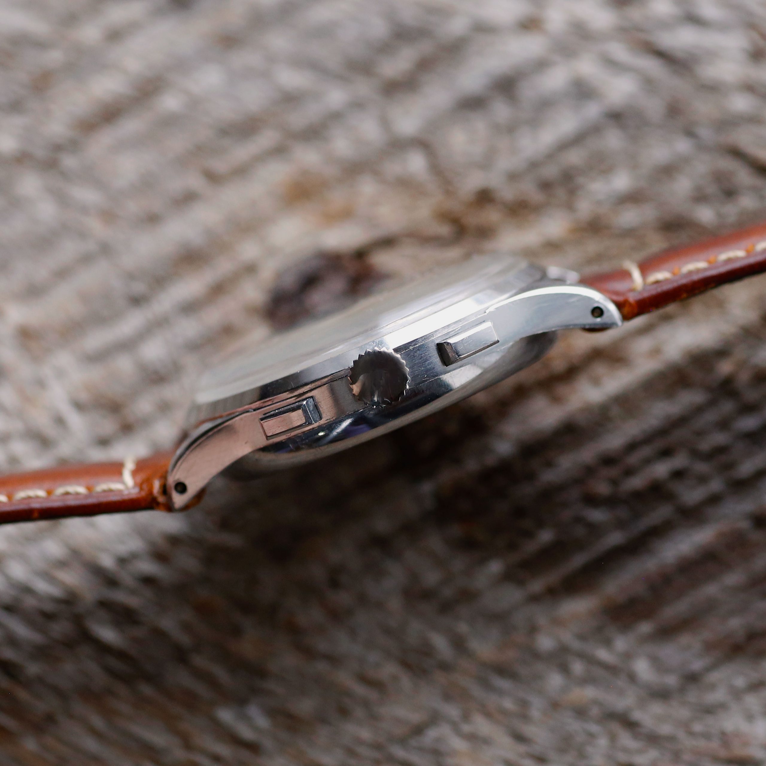 The Universal Geneve Uni-Compax Chronograph features an overhauled and restored high-end UG 285 manual wind lateral clutch column wheel movement. Operating the chronograph on this watch is a real pleasure as the pusher action is incredibly smooth. The watch runs at 18,000 vph. The movement is manual winding with a good power reserve. The watch is 35mm in diameter, which was large for the period. The new high-end stitched leather strap comfortably fit wrists up to 8″. The dial, case, movement are all signed Universal Geneve.