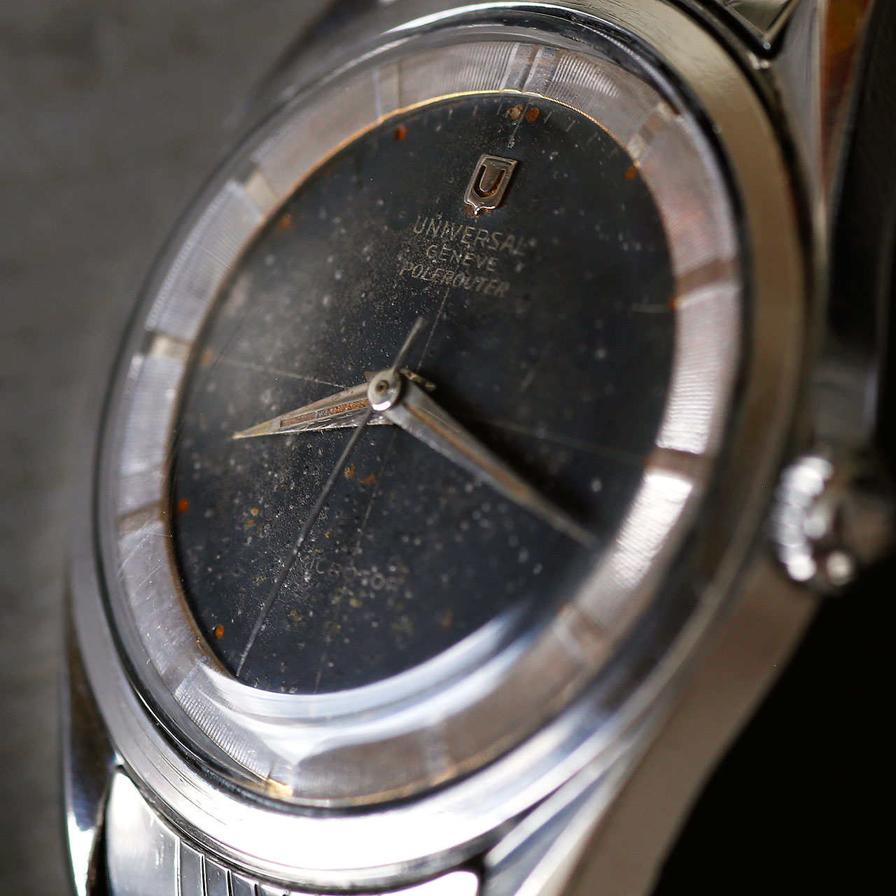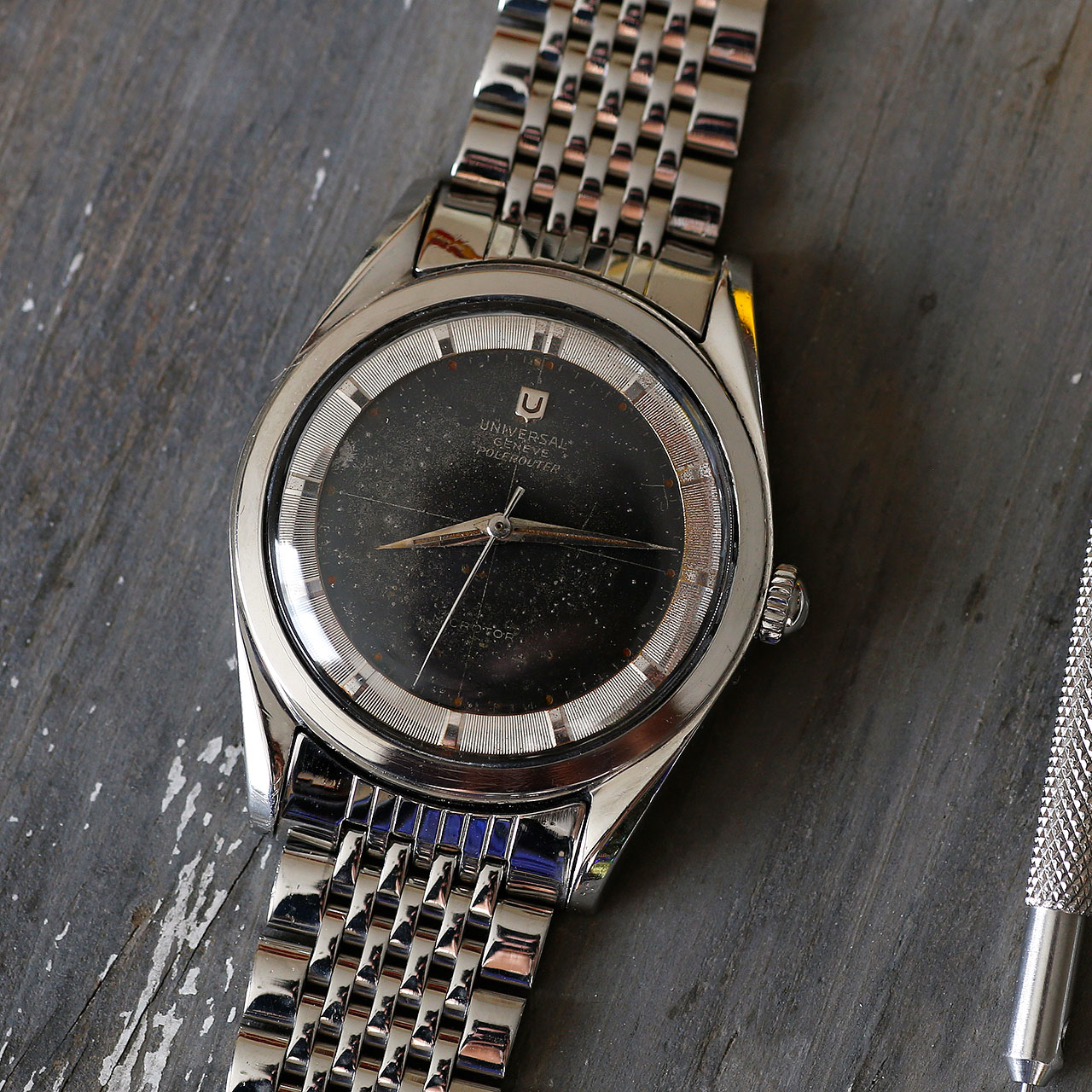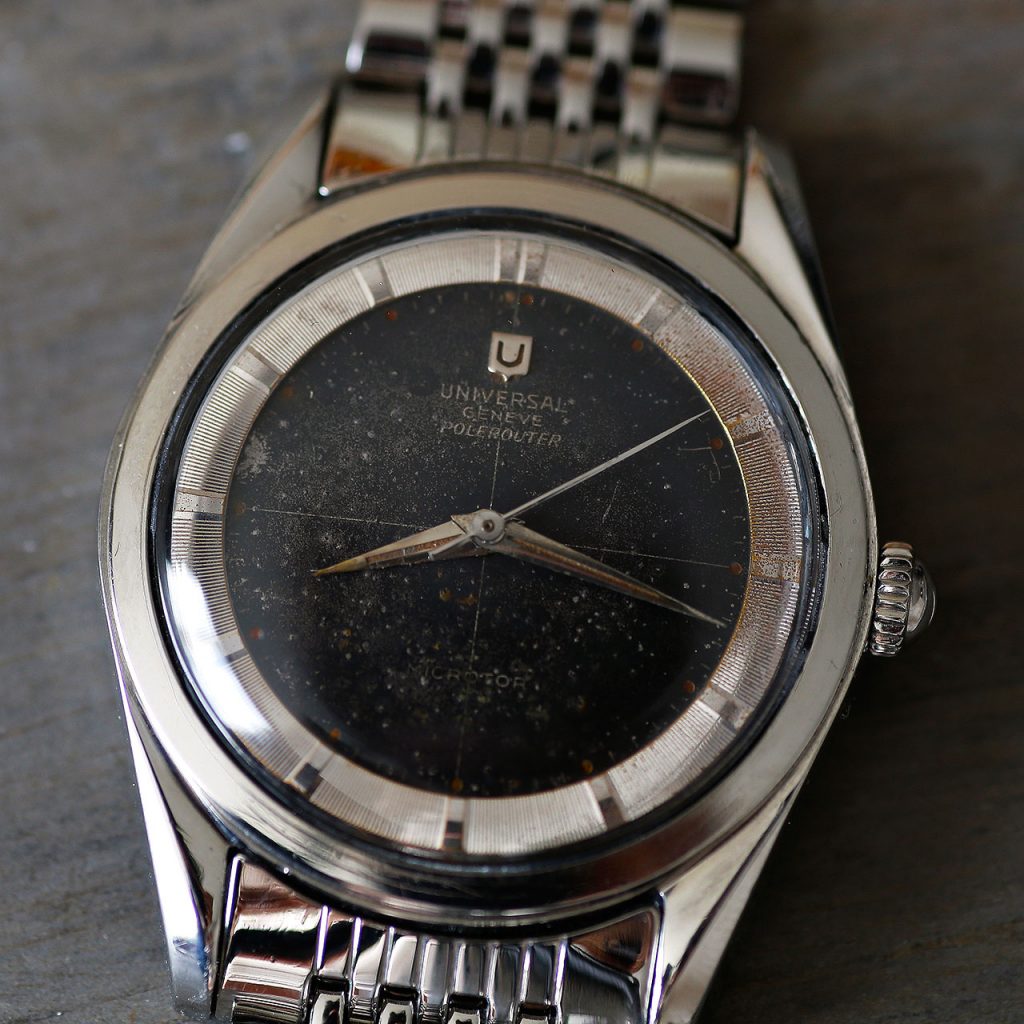 The Polerouter was Gerald Genta’s first smash hit, which he designed for Universal Geneve in his 20ties. The watch features a stunning black patina dial with cross hairs and a Universal Geneve logo at 12 o’clock. The writing “Microtor” is present at 6 o’clock which is a unique feature of the early microrotor Polerouters (later ones include the word “automatic”). The wonderful silver bezel shows hour markers and is a beautiful contrast against the black dial. The case of this Polerouter is the larger version of the two available in 1957 (as denoted by the -2 in the serial #), with this one being the larger 35.5mm diameter. The watch has a blank caseback with no logo, which was also a unique feature of the very early Polerouters (later ones had a logo engraved on the caseback).