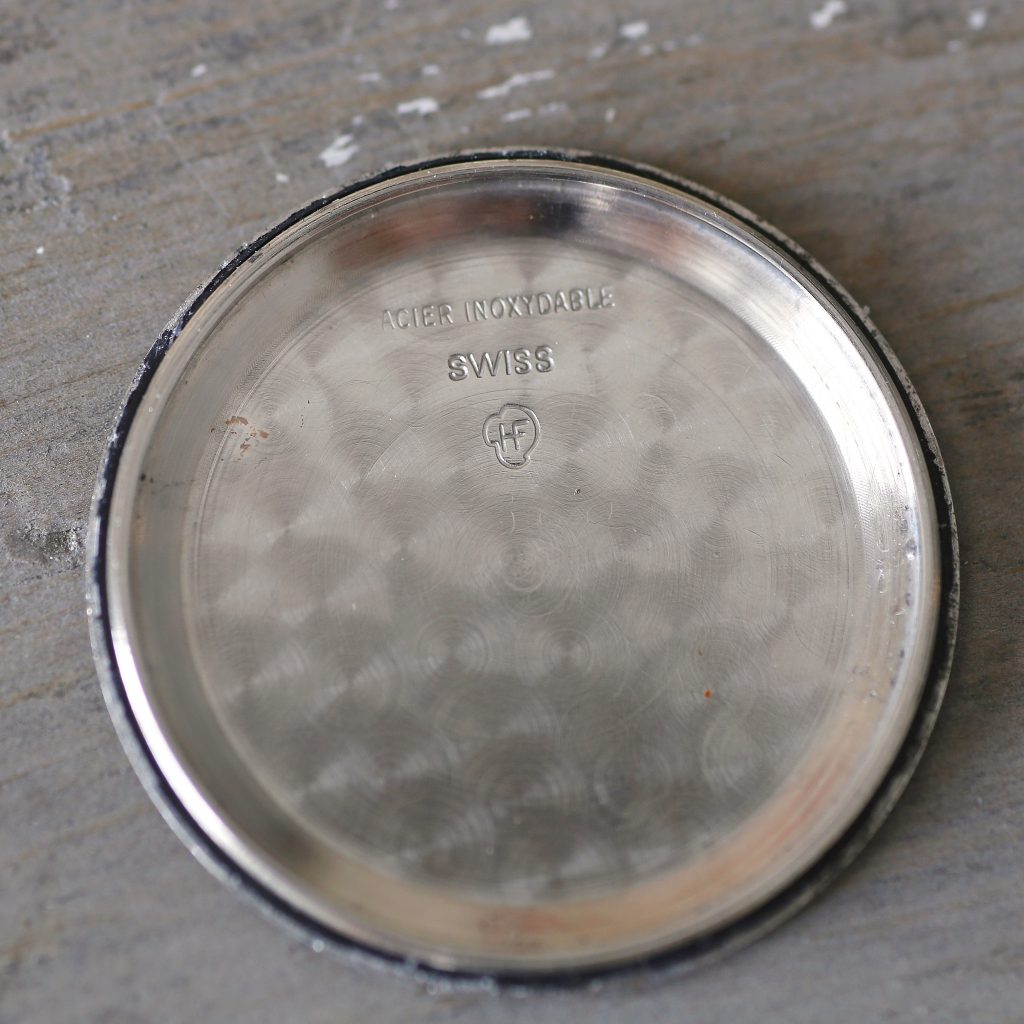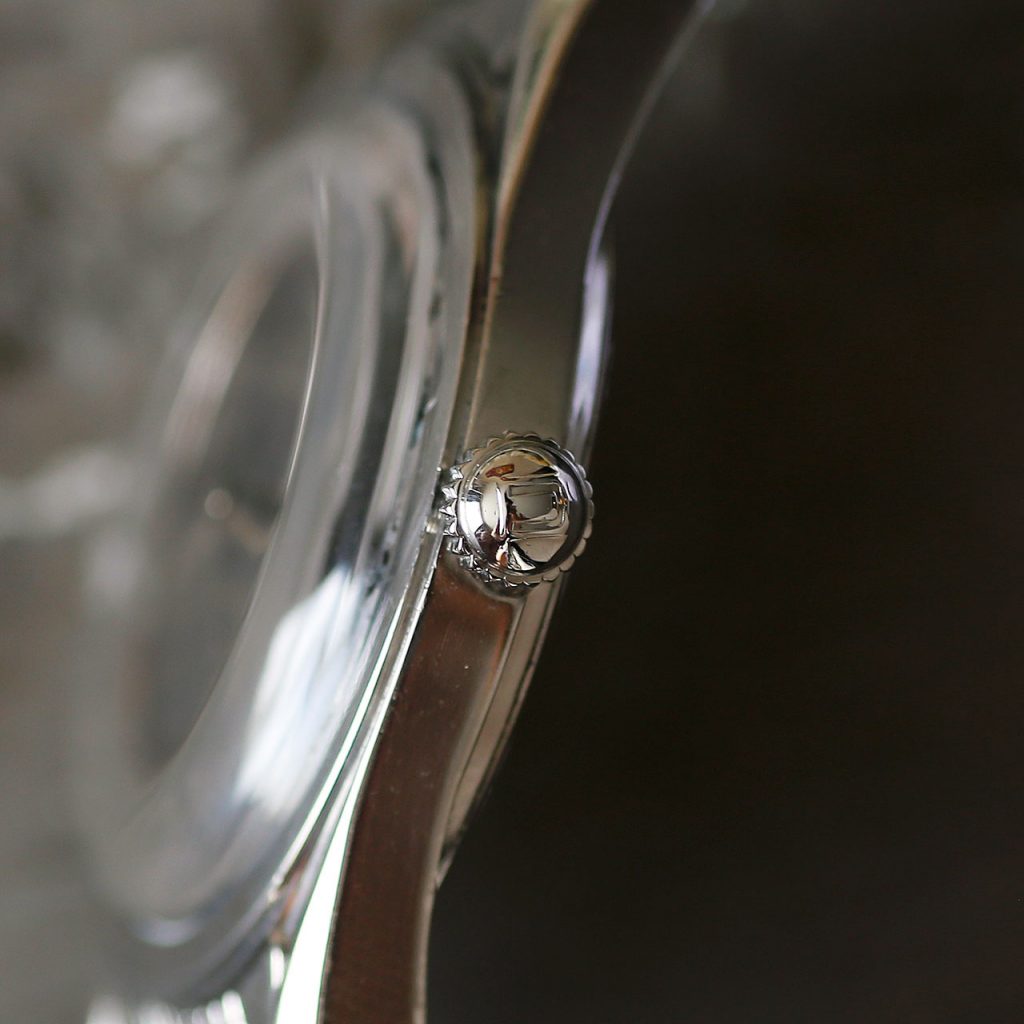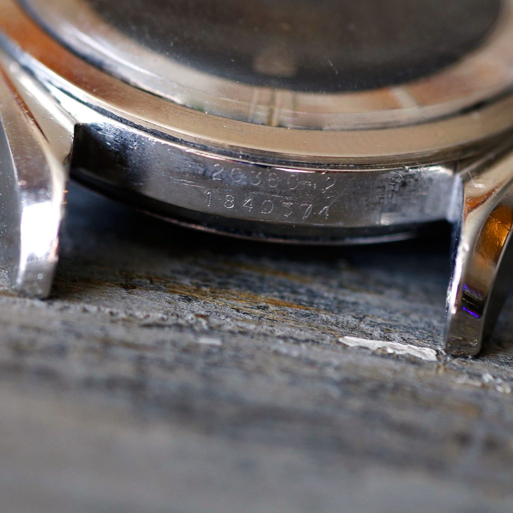 The Polerouter was Gerald Genta’s first smash hit, which he designed for Universal Geneve in his 20ties. The watch features a stunning black patina dial with cross hairs and a Universal Geneve logo at 12 o’clock. The writing “Microtor” is present at 6 o’clock which is a unique feature of the early microrotor Polerouters (later ones include the word “automatic”). The wonderful silver bezel shows hour markers and is a beautiful contrast against the black dial. The case of this Polerouter is the larger version of the two available in 1957 (as denoted by the -2 in the serial #), with this one being the larger 35.5mm diameter. The watch has a blank caseback with no logo, which was also a unique feature of the very early Polerouters (later ones had a logo engraved on the caseback).