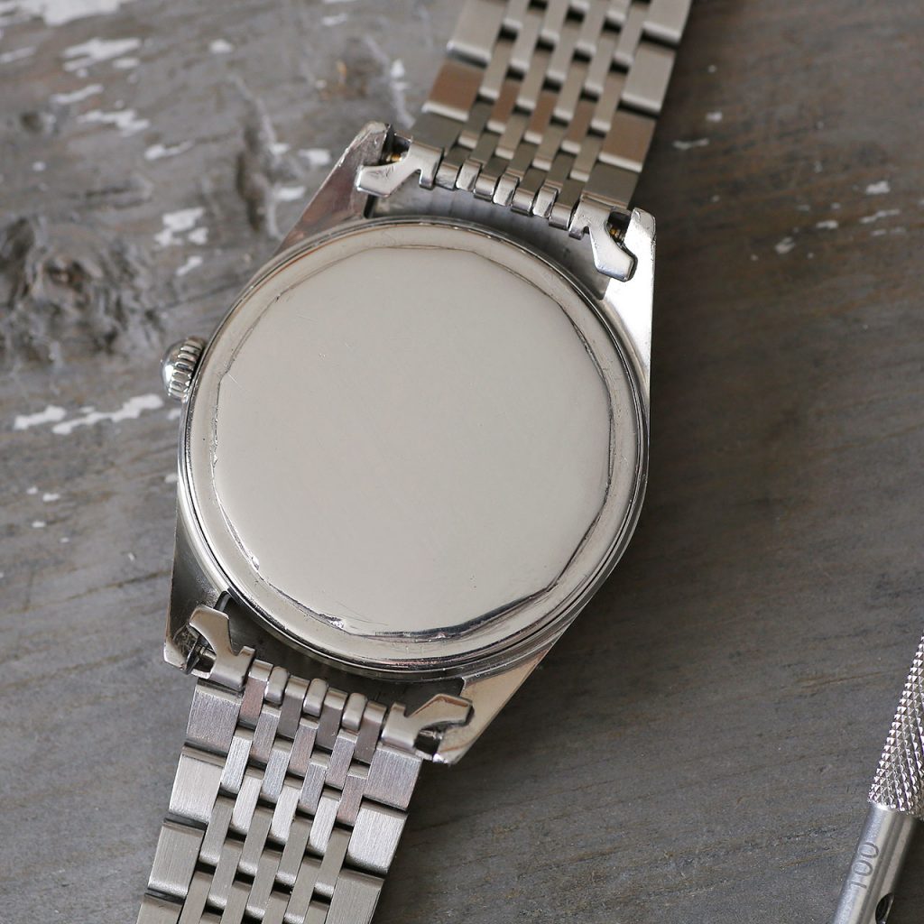 This Polerouter features the beautiful Universal Geneve 215 automatic microrotor movement. The beat rate for this watch is 18,000 vph. The watch is 35.5mm in diameter. The new solid link adjustable bracelet with integrated end-links will fit wrists up to 8″ in diameter making it suitable for any wrist size. The dial, movement, crown, and case are all signed Universal Geneve. The serial number and reference is still present between the lugs (usually these are worn off). The caseback and crown have new gaskets, and combined with the new crystal, this watch features mid-range water resistance.