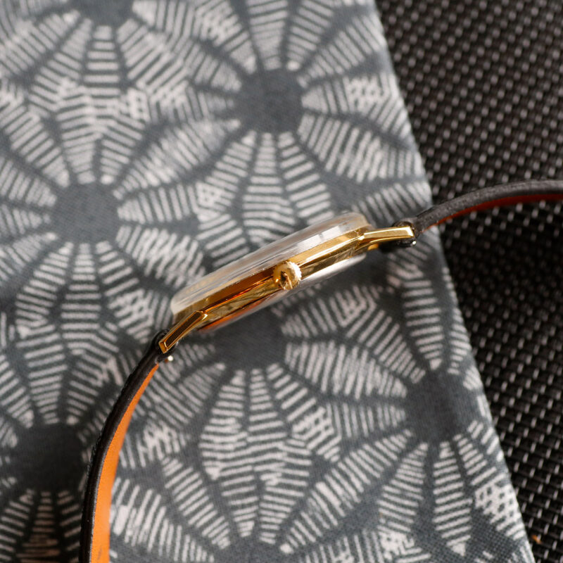 Introducing the stunning 1959 Takano Chateau Superior Guilloché timepiece, a masterpiece of Japanese horology history. Crafted with a 14k gold case and a mesmerizing guilloché dial, this watch boasts a Takano 521 19 Jewels hand-wound movement. Impeccably restored and in like-new condition, this rare vintage piece is a collector’s dream, paired with a high-end authentic lizard strap for a touch of luxury.