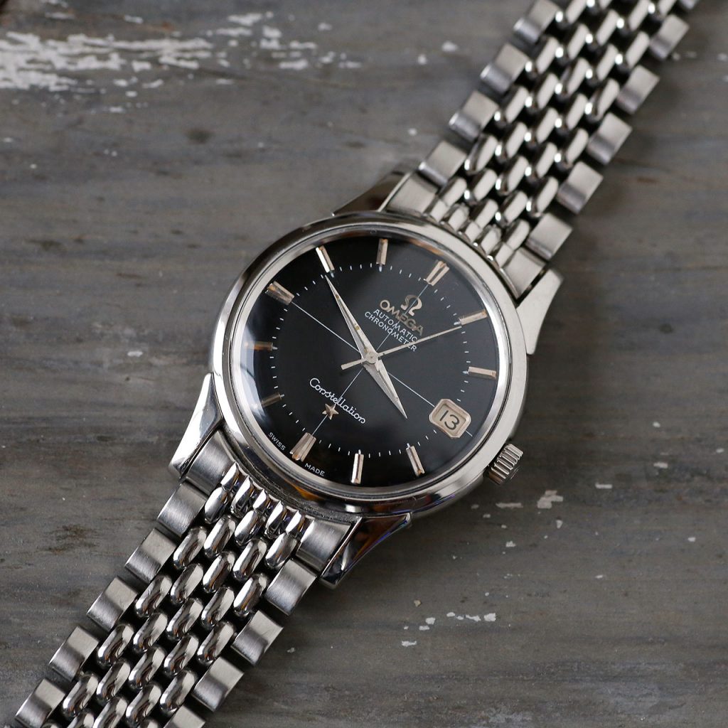 This 1960 Omega Constellation 14393 with a black pie-pan dial and original bracelet is stunning. The 14393 Omega Constellation was produced from approximately 1959 to 1962 and is an early version of the pie-pan Omega Constellations. The watch features a stunning steel case with square lugs, a beautiful black dial with cross hairs and a date at 3 o’clock, a stunning gold observatory medallion on the caseback, and a beautiful original Omega beads of rice bracelet. The watch is in fantastic condition. The watch features a new Omega crystal, original case, an original Omega bracelet refinished to OEM specs, and a beautiful Omega 561 chronometer automatic movement that has been overhauled and restored to OEM specs.