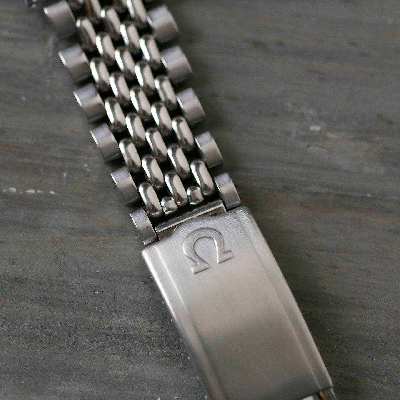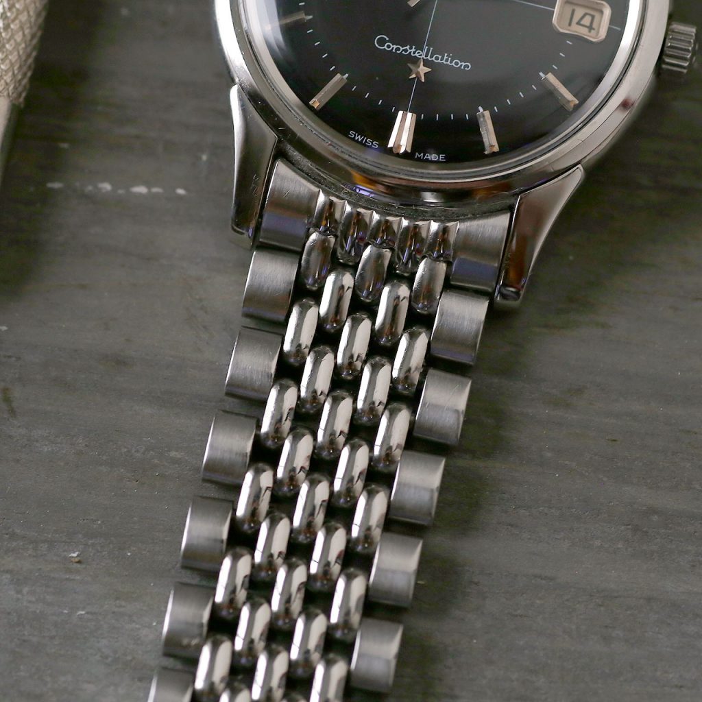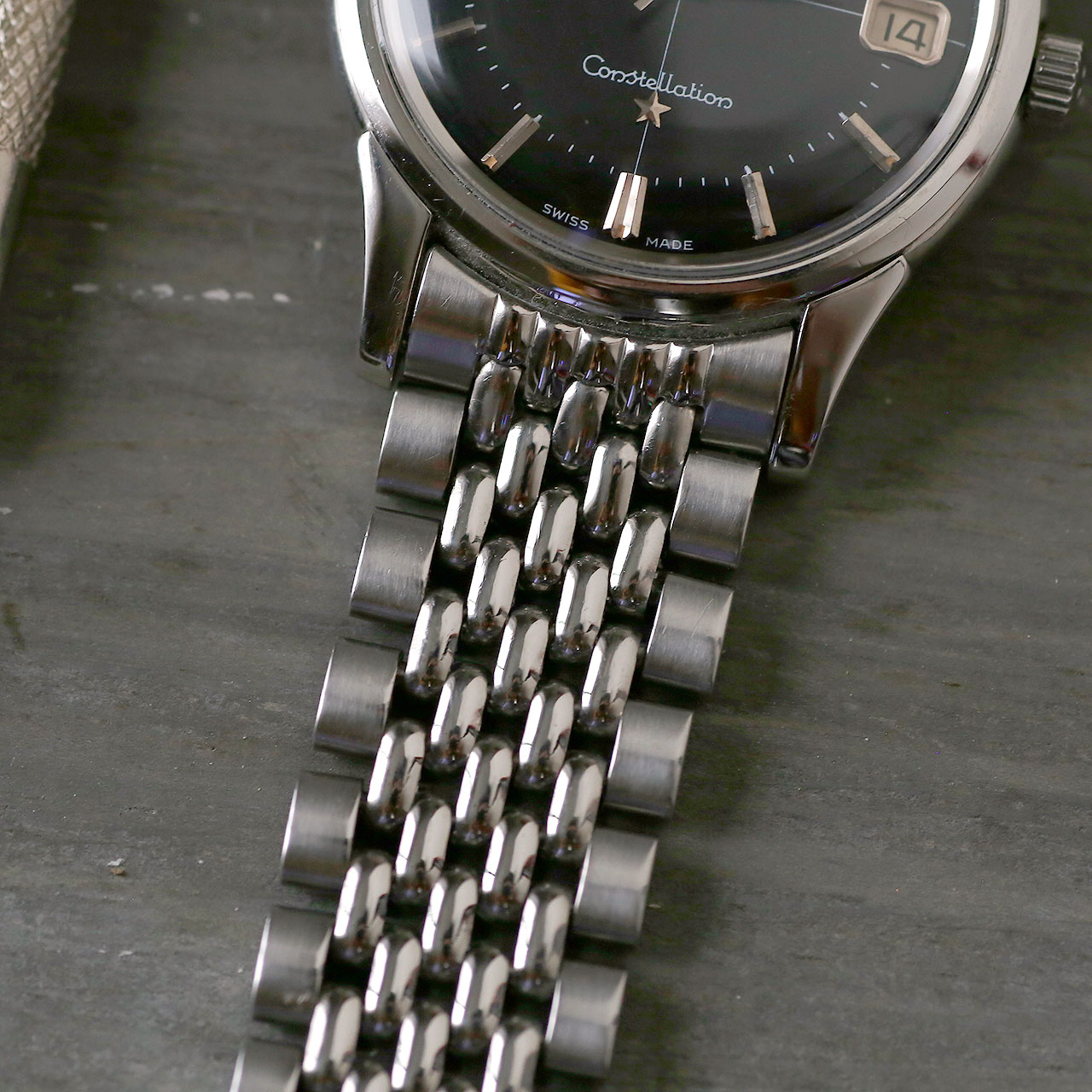 This Omega Constellation features the Omega 561 automatic movement with date. The date function has semi-quickset (cycle between 9 o’clock and 12 o’clock to advance the date). The beat rate for this watch is 19,800 vph. The watch is 35mm but wears larger due to the integrated end-link Omega bracelet. The adjustable Omega bracelet will fit wrists up to 7.5″ in diameter. The case, dial, crown, movement, crystal, bracelet are all signed Omega. The crown is a regular knurled Omega crown which is correct for this early Constellation reference. The caseback and crown have new gaskets and combined with the new Omega crystal, this watch features mid-range water resistance.