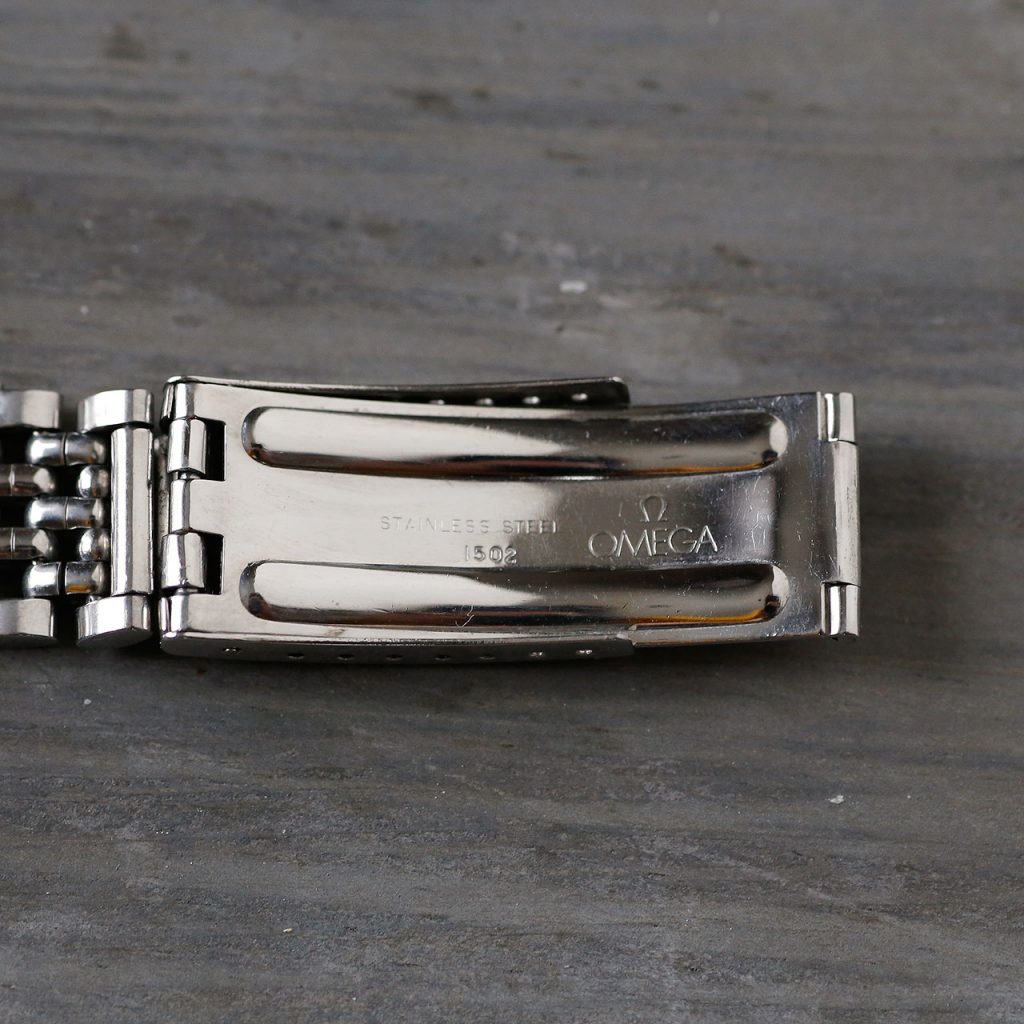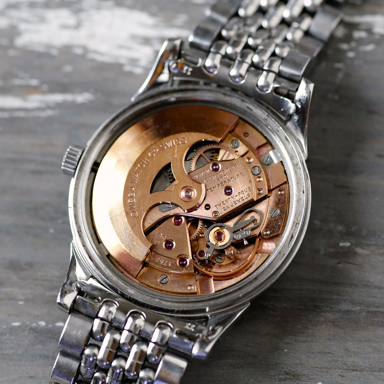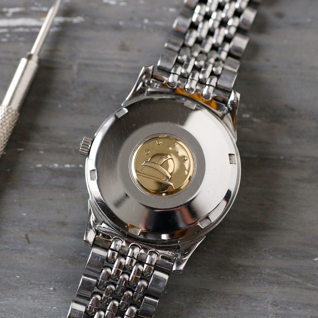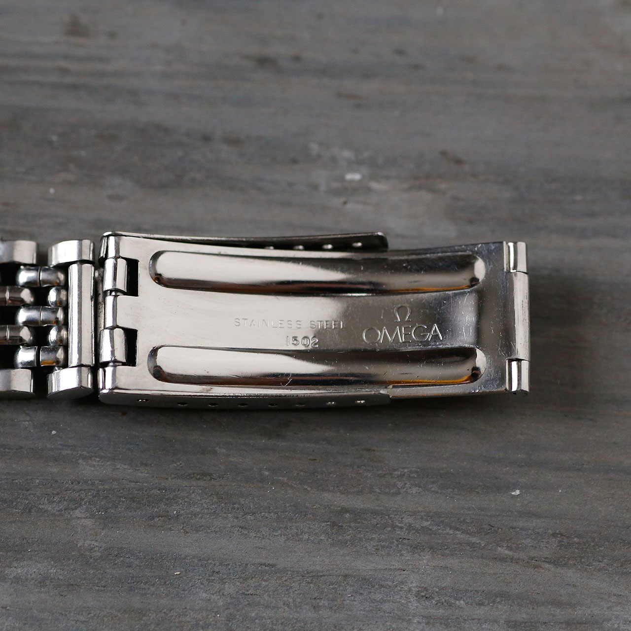 This Omega Constellation features the Omega 561 automatic movement with date. The date function has semi-quickset (cycle between 9 o’clock and 12 o’clock to advance the date). The beat rate for this watch is 19,800 vph. The watch is 35mm but wears larger due to the integrated end-link Omega bracelet. The adjustable Omega bracelet will fit wrists up to 7.5″ in diameter. The case, dial, crown, movement, crystal, bracelet are all signed Omega. The crown is a regular knurled Omega crown which is correct for this early Constellation reference. The caseback and crown have new gaskets and combined with the new Omega crystal, this watch features mid-range water resistance.