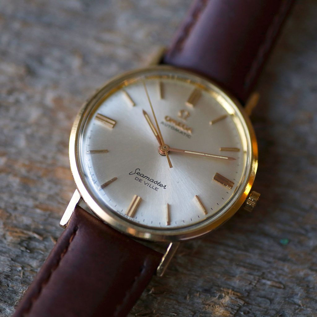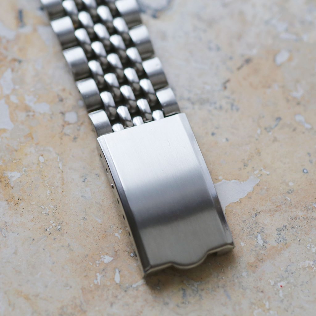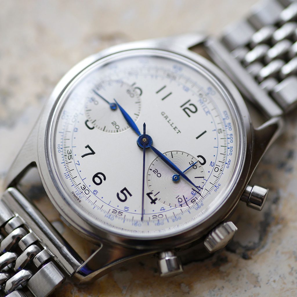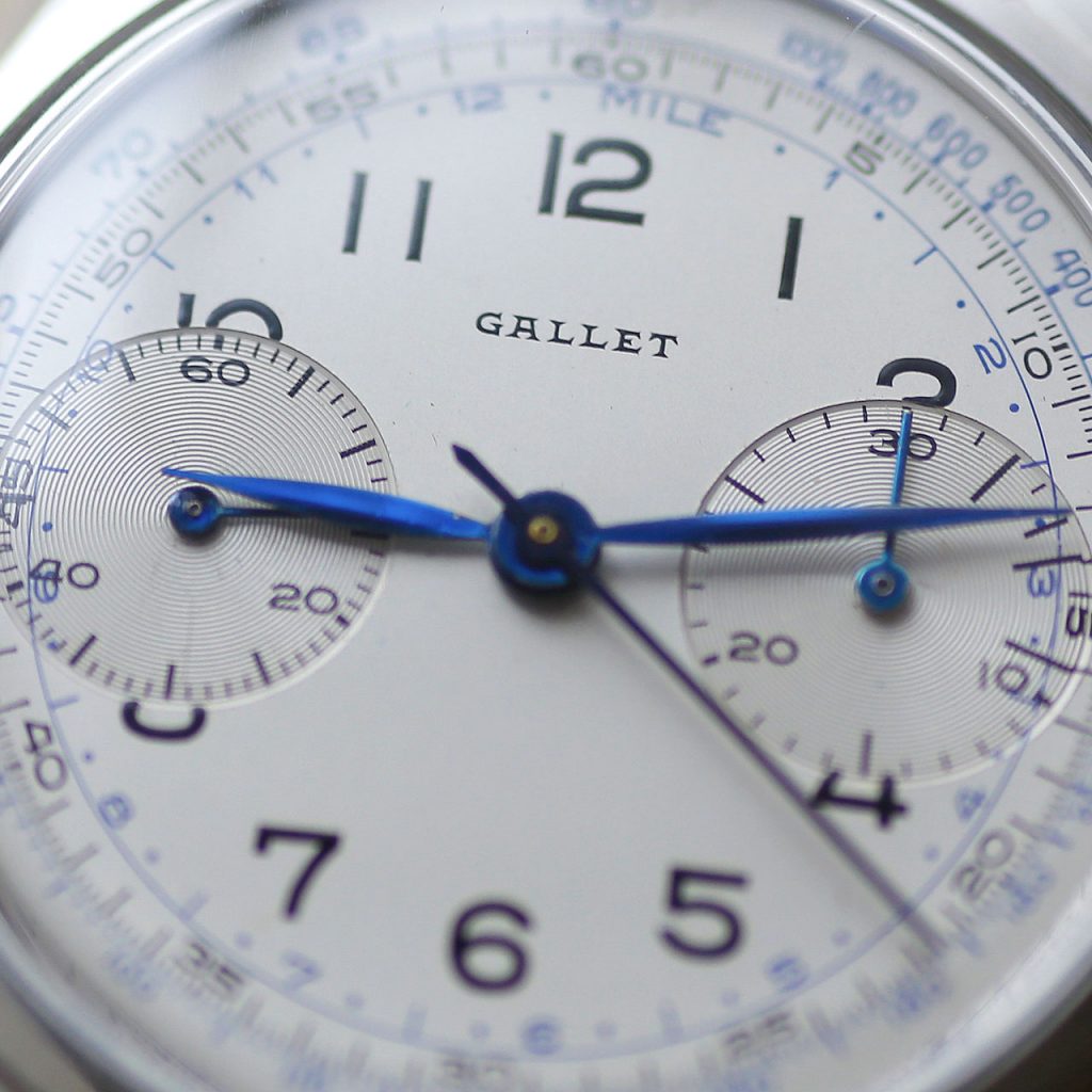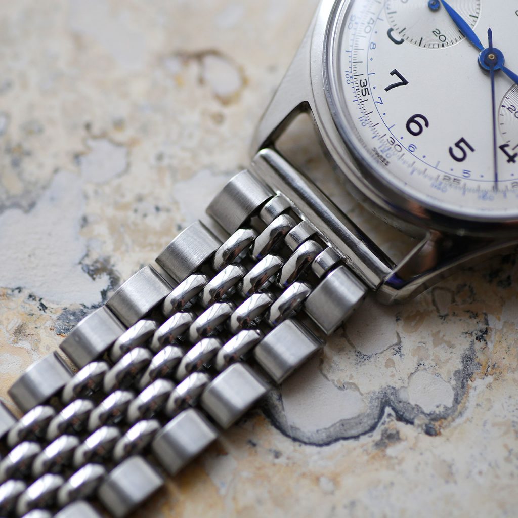 This Gallet Chronograph features an overhauled and restored original Gallet Venus 188 that runs at 18,000 vph and tracks seconds and minutes up to 30. The movement is manual wind and has a good power reserve. The watch is 36mm in diameter. The watch takes a 18mm strap. The adjustable beads-of-rice bracelet will fit wrists up to 7 3/4″. The dial, case, movement are all signed Gallet & Co. The caseback, crown, and chronograph pushers have new gaskets and combined with the new crystal, this watch features mid-range water resistance.