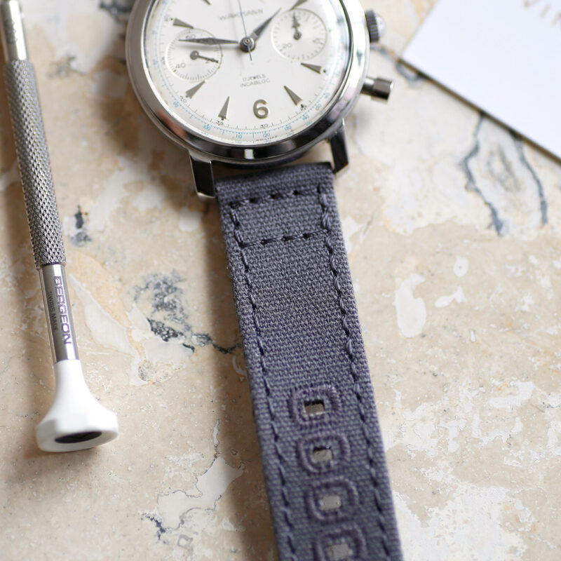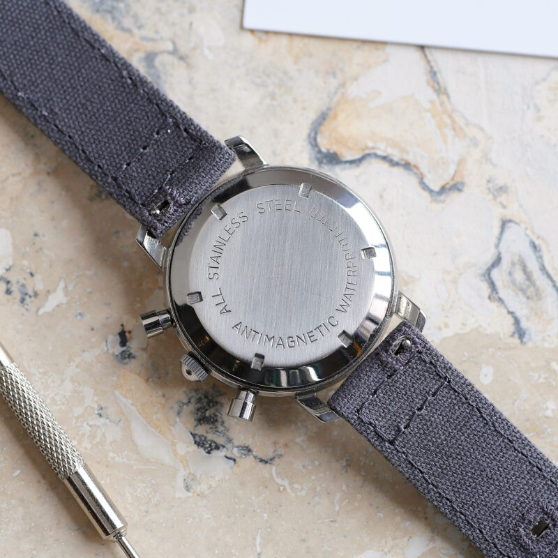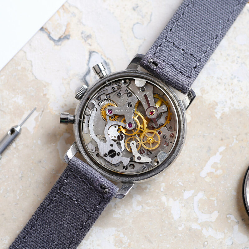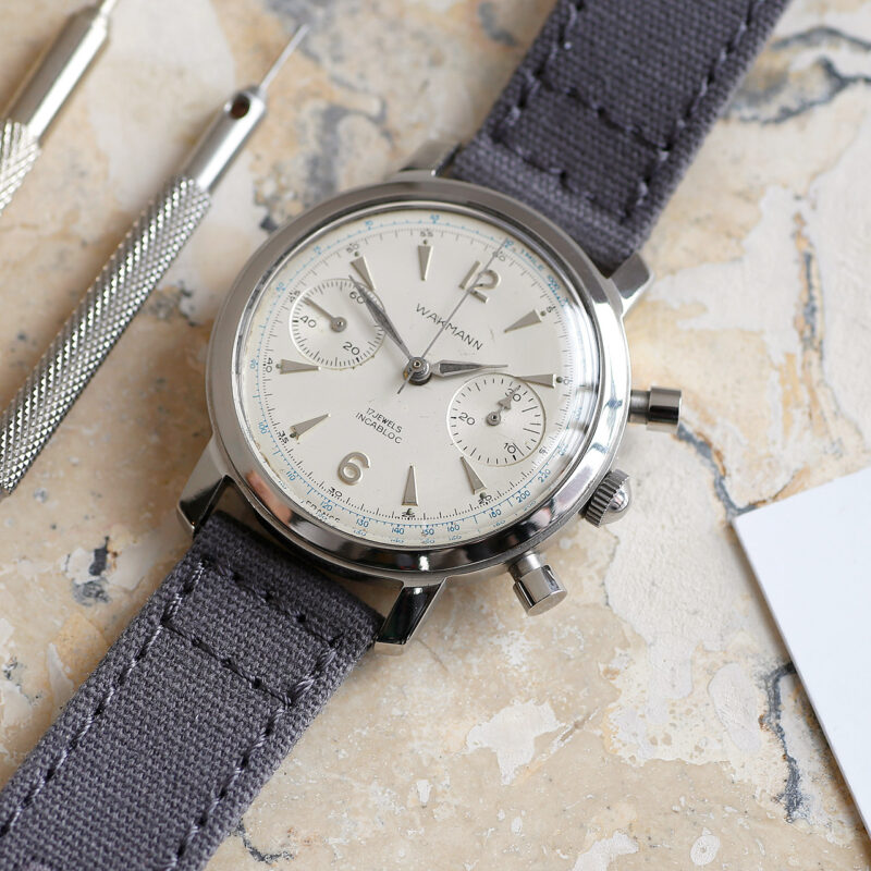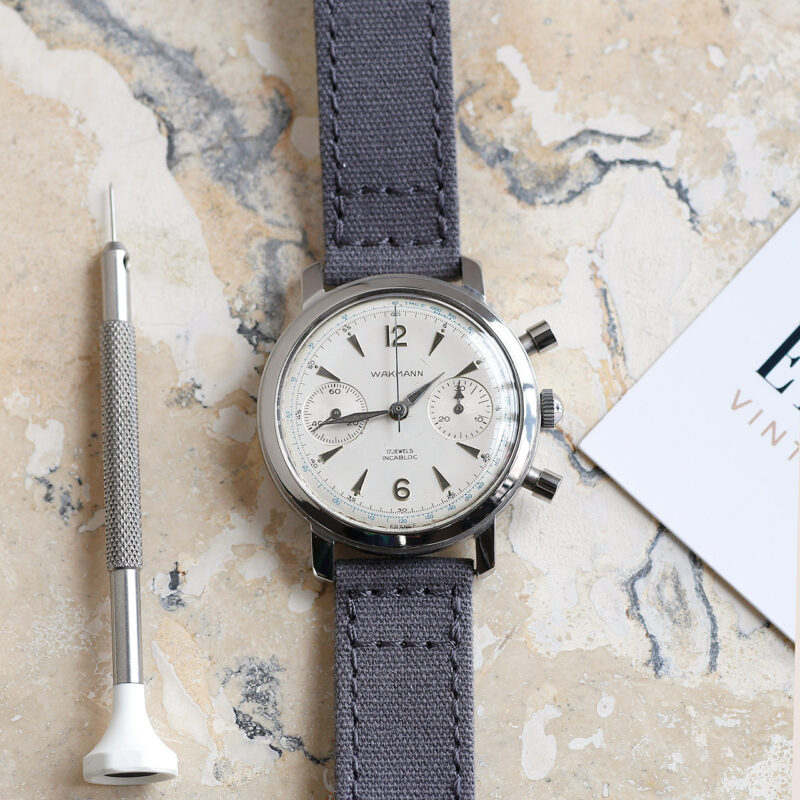 With a recommended wrist size of 6″ to 7 3/4″, this watch offers a comfortable fit for a wide range of wearers. The original dial, in excellent condition for its age, displays minor blemishes that add character to its vintage charm. Paired with a new canvas strap, this authentic Wakmann timepiece is not just a watch but a valuable addition to any collector’s ensemble.