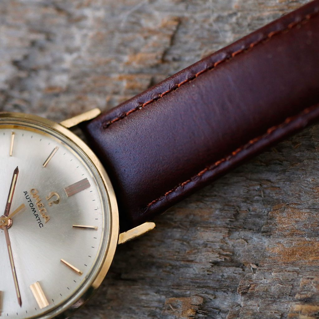 This Seamaster Deville features the beautiful and venerable Omega 550 automatic movement. The beat rate for this watch is 19,800 vph. The watch is 34.25mm but wears much larger (feels like a 36-37mm watch) due to the thin bezel and large dial. The new stitched leather strap will fit wrists up to 8″ in diameter. The case, dial, crown, movement, crystal, buckle are all signed Omega. The crown has a new gasket and combined with the new Omega crystal and one-piece case design, this watch features mid-range water resistance.