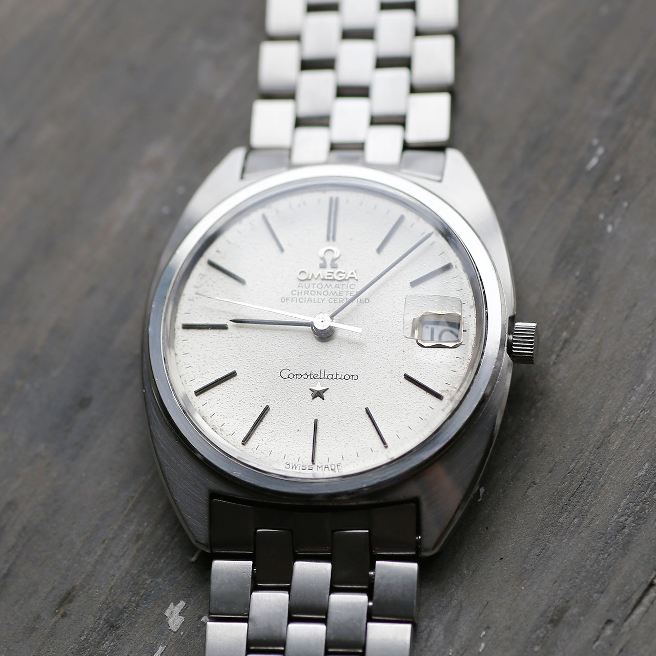 This 1966 Omega Constellation 168.017 is a beautiful mint example of the Gerald Genta designed Omega C-Case Constellation. The watch features a beautiful textured silver dial, black-stick hands, black-stick indicies, a date at 3 o’clock with magnifier, a beautifully restored steel case with the Constellation observatory emblem on the caseback, and the original beautifully restored Omega Constellation brick bracelet. The watch features a new Omega OEM cyclops acrylic crystal, delicately cleaned dial, cleaned and polished hands, restored steel case, restored original Omega Constellation bracelet, and an Omega 564 automatic movement that has been overhauled and restored to OEM specs. The watch is in beautiful restored condition as per our extensive restoration and authentication process.
