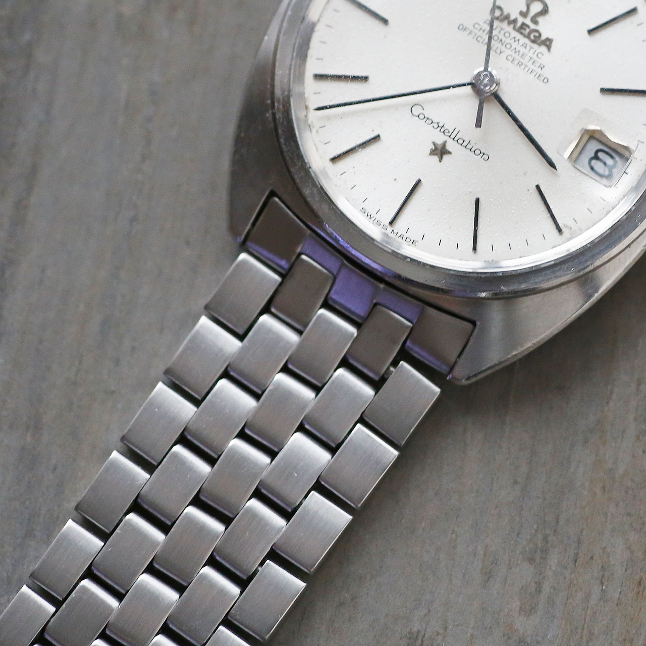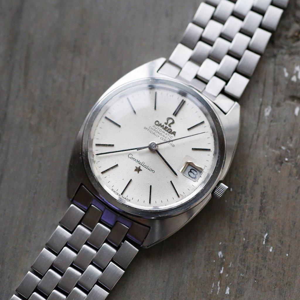 This 1966 Omega Constellation 168.017 is a beautiful mint example of the Gerald Genta designed Omega C-Case Constellation. The watch features a beautiful textured silver dial, black-stick hands, black-stick indicies, a date at 3 o’clock, a beautifully restored steel case with Constellation observatory emblem, and the original beautifully restored Omega bracelet.