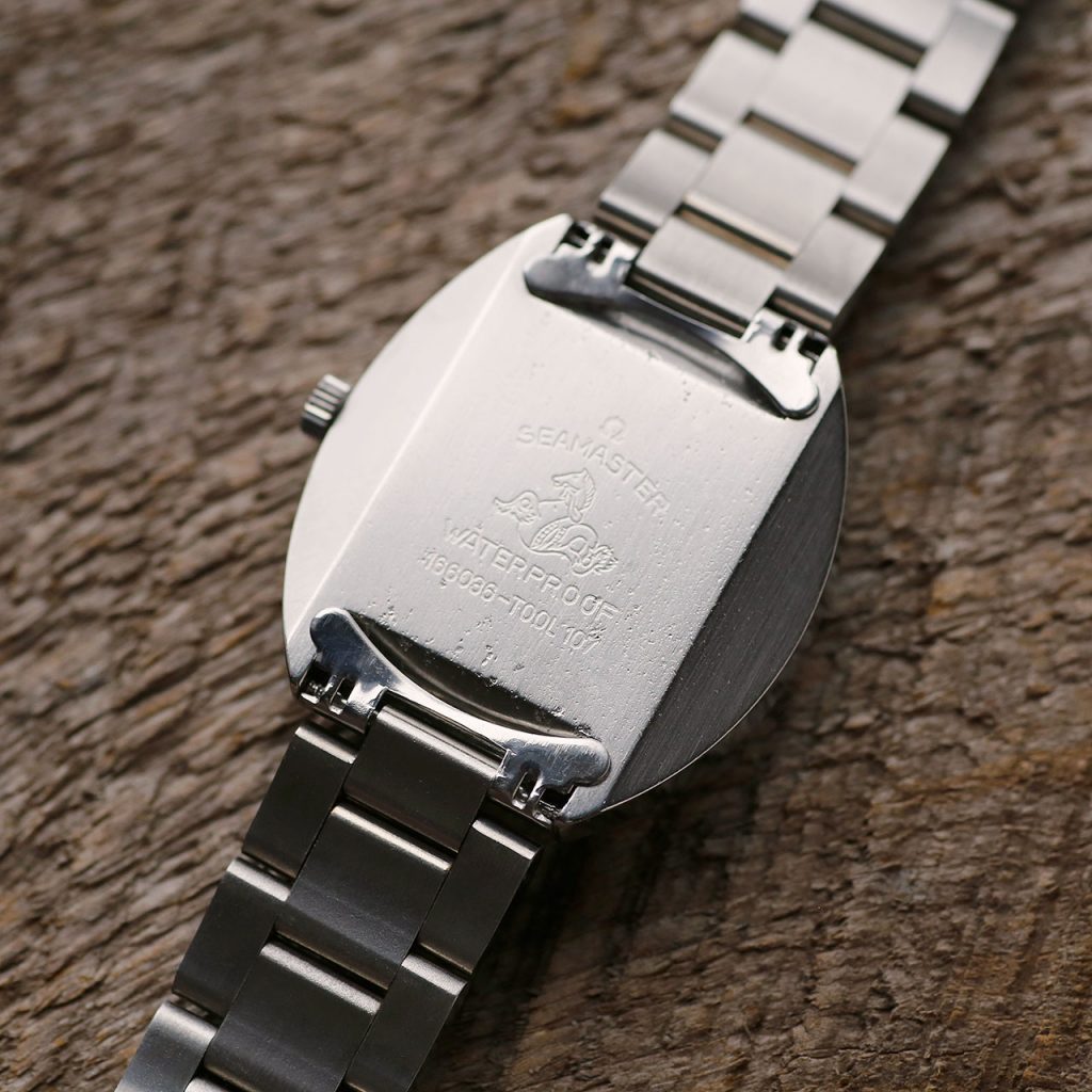This Seamaster features the beautiful Omega 752 automatic movement with day date and a push-pull quickset date. The beat rate for this watch is 19,800 vph. The 752 Omega movement was one of the last movements based on Omega’s 550 series which are arguably some of the most resilient vintage movements in existence. The watch is 36.5mm in diameter, but wears larger due to the case design and the bracelet. The new adjustable bracelet will fit wrists up to 8″ in diameter making it suitable for any wrist size. The dial, movement, crystal, crown, and case are all signed Omega. This watch is a 1-piece case design with a new crystal and features mid-range water resistance.