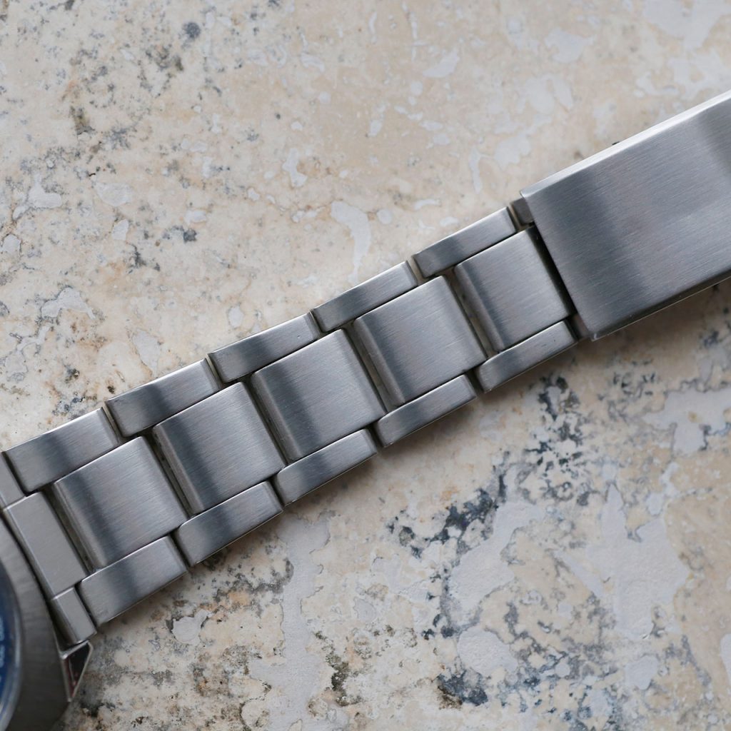 The watch is 38mm in diameter but does wear slightly larger due to the cushion case shape. The bracelet is 20mm. The dial is signed Jaquet Droz. The case, crown, and movement are unsigned which was common during this period. The caseback and crown have new gaskets and combined with the new dive crystal, this watch features mid-range water resistance.