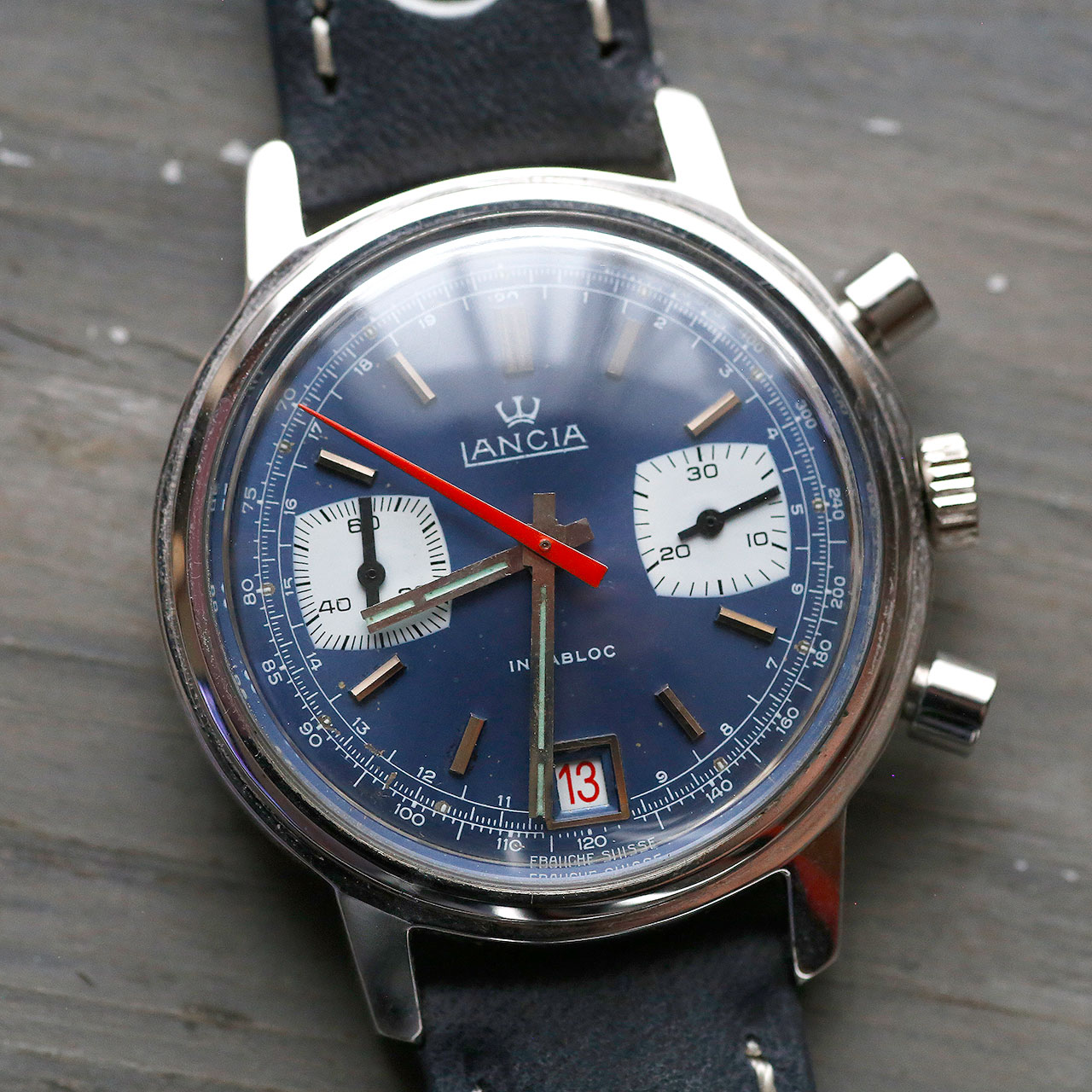 Gentleman, start your engines! This Lancia chronograph just screams 1970s rally racing. With its lovely blue dial, an orange chronograph second hand that pops, and unique chronograph registers that resemble car gauges, the watch has a cool racing look. Lancia is a watch brand that was used briefly by Vulcain during the 1970s, and this release was possibly one of their best.