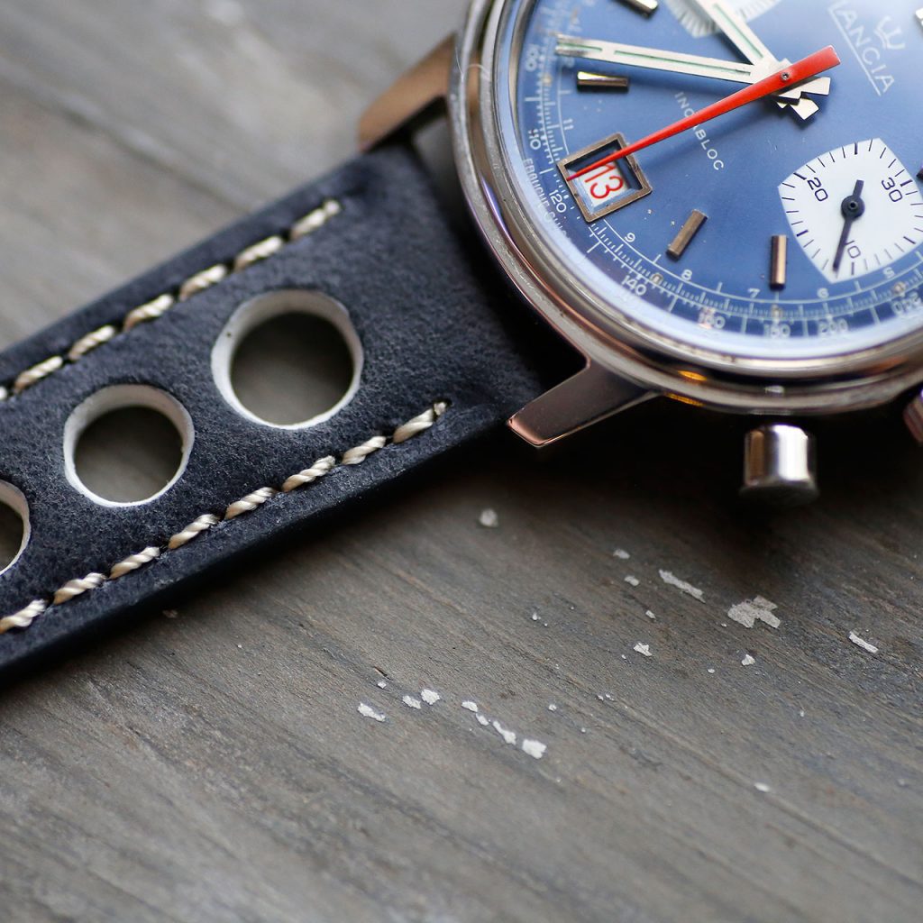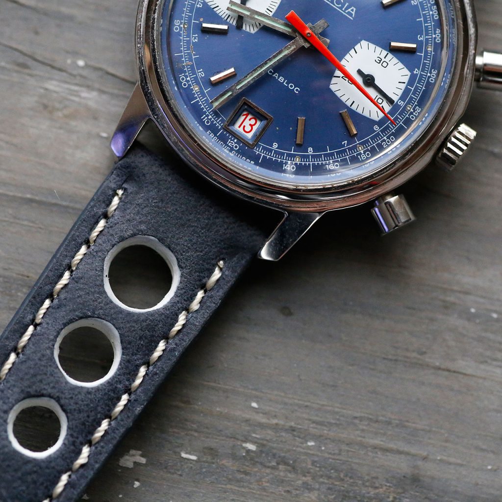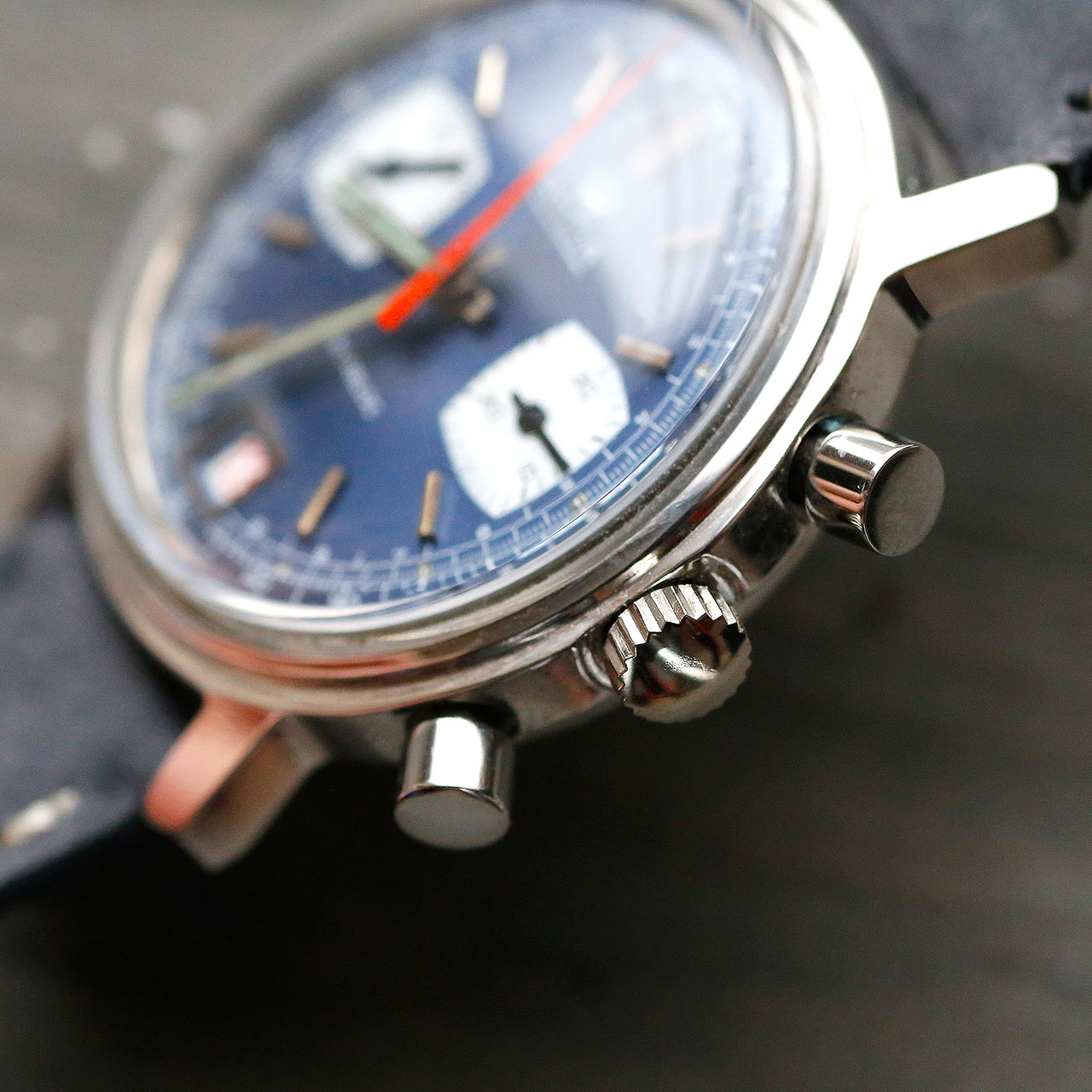 Gentleman, start your engines! What a cool piece that just screams 1970s rally racing. This rare Lancia chronograph features a lovely blue dial, an orange chronograph second hand that pops, and unique chronograph registers that resemble car gauges, giving it an overall racing look. Lancia is a watch brand that was used briefly by Vulcain during the 1970s, and this release was possibly one of their best. The watch features a 30 minute register and can track seconds and minutes up to 30. The 6 o’clock date window is a nice touch as well. The watch features a new dive crystal, a finely cleaned dial and hands, a restored original case that is finished to OEM specs, a new blue suede rally racing strap, and a movement that has been overhauled and restored to OEM specs. The watch is in beautiful restored condition as per our extensive restoration and authentication process.