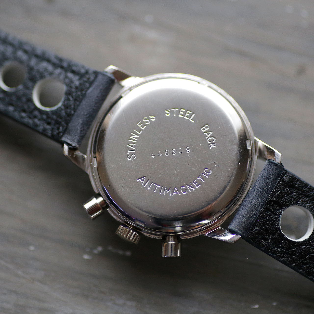 This Lancia chronograph model is powered by the venerable Valjoux 7734 cam-driven lateral clutch hand wind chronograph movement (the grandparent of the Valjoux 7750 used today), which runs at 18,000 vph. The movement is hand wind and has a good power reserve. The watch is 37.5mm in diameter and has a 18mm strap size. The caseback and crown have new gaskets and combined with the new dive crystal, this watch features mid-range water resistance.
