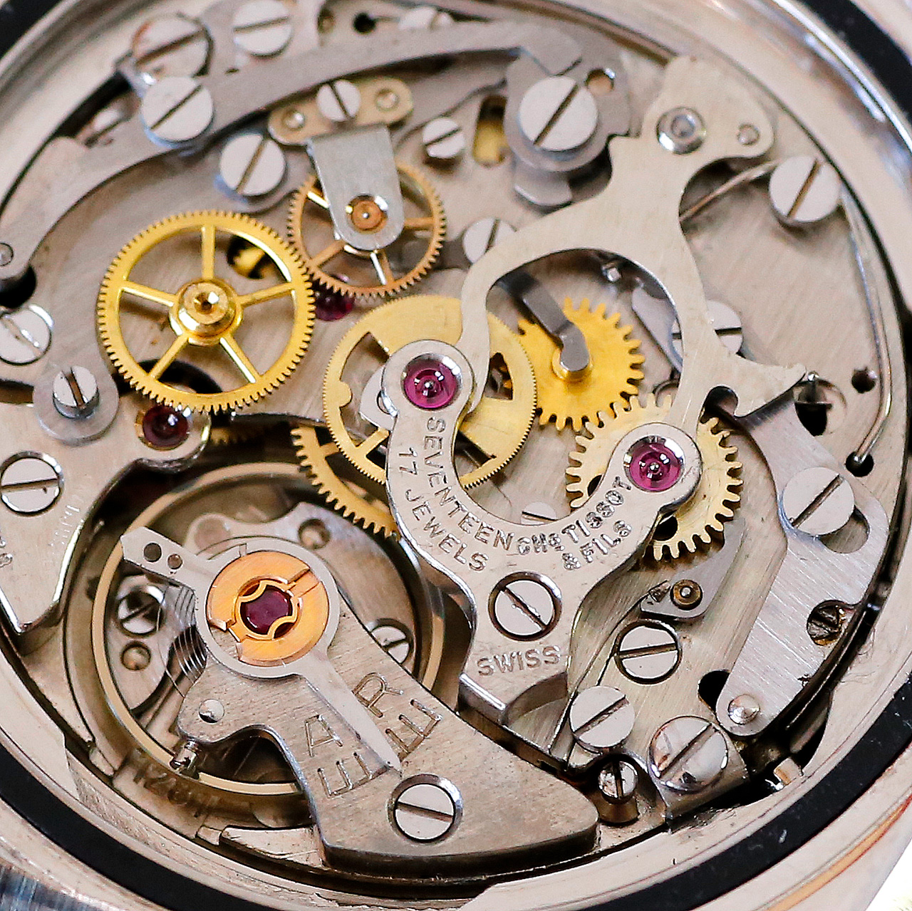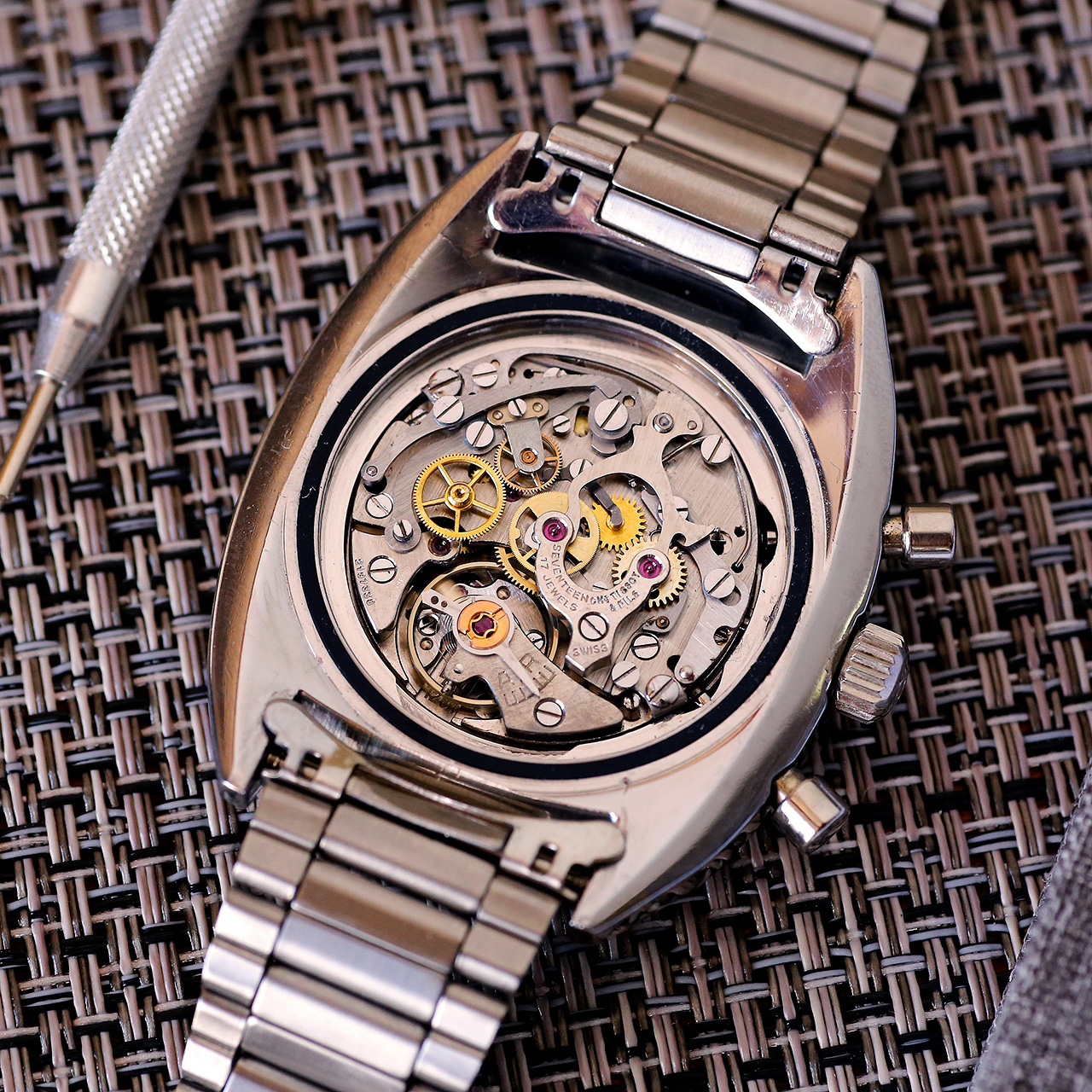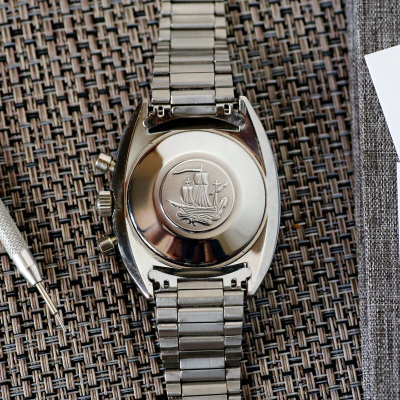 With an oversized 42mm diameter case, this Tissot Seastar T.12 is an oversized watch, even by modern standards. The intricate details such as the stylish chunky hour markers and the ship engraving on the caseback create a sense of nostalgia and charm, making it a must-have. The watch is fitted with the highly regarded triple-register Tissot Lemania 1281 chronograph movement–the movement that served as the base movement for the iconic Omega Speedmaster 861. The chronograph features a 60 second register, a 30 minute register, and a 12 hour register. The Lemania 1281 is renowned for its precision and reliability, and has been fully overhauled and restored to ensure optimal performance.