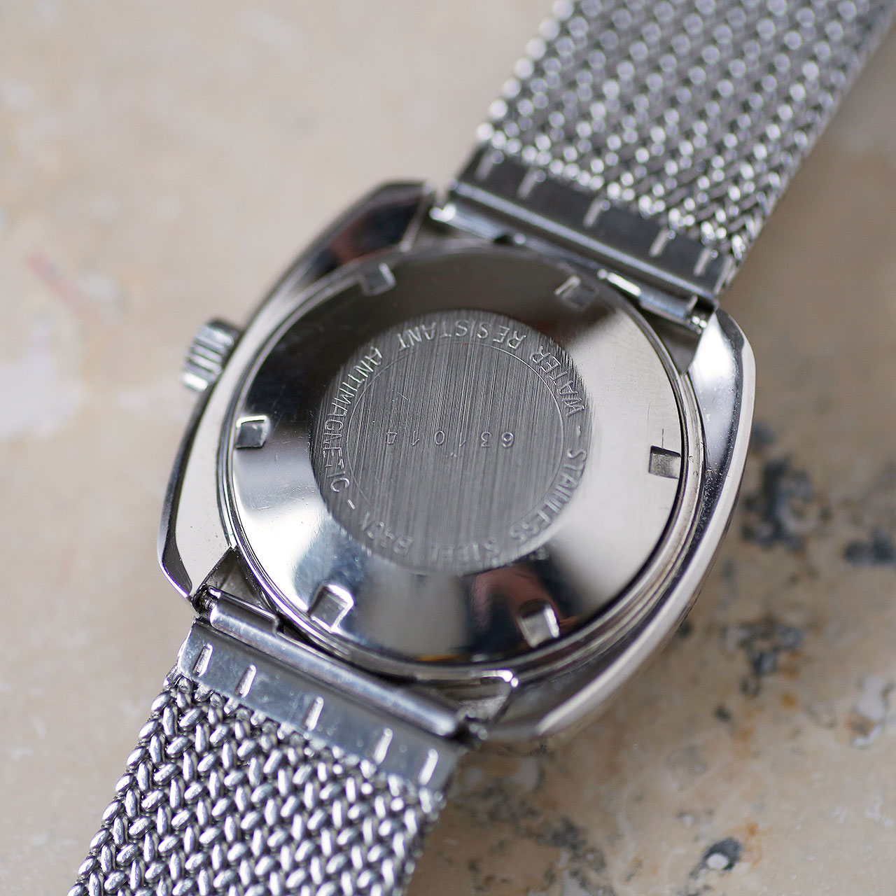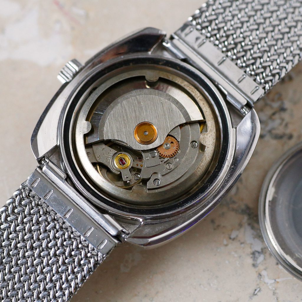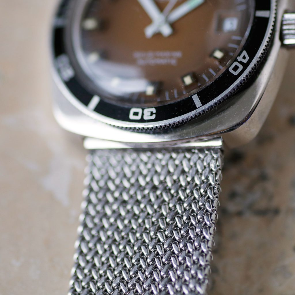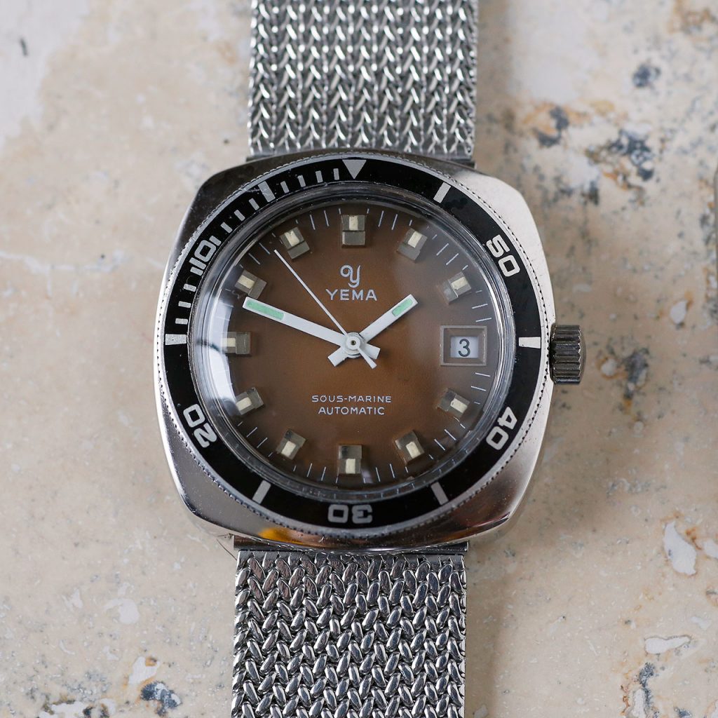 This 1970s Yema Sous-Marine is a funky cool diver from the period when Yema made some of their best watches. Featuring a unique square case design, a functional bi-directional dive bezel, chunky raised hour markers with rectangular white hands, and a beautiful deep chocolate brown gradient dial with date at 3 o’clock. The dial and hands contain tritium lume that appears in a warm yellow hue (lume no longer functional as expected). The watch is in stunning condition. The watch has a new acrylic dive crystal, freshly cleaned hands and dial, an overhauled original bezel, a case refinished to OEM specs, a new mesh bracelet, and a unique French made FE3611 (France Ebauches) automatic movement that has been overhauled and restored to OEM specs. This Yema Sous-Marine is in beautiful restored condition as per our extensive restoration and authentication process.