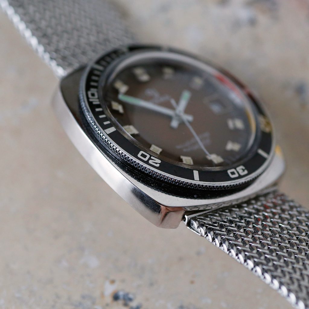 This 1970s Yema Sous-Marine is a funky cool diver from the period when Yema made some of their best watches. Featuring a unique square case design, a functional bi-directional dive bezel, chunky raised hour markers with rectangular white hands, and a beautiful deep chocolate brown gradient dial with date at 3 o’clock. The watch is in stunning condition.