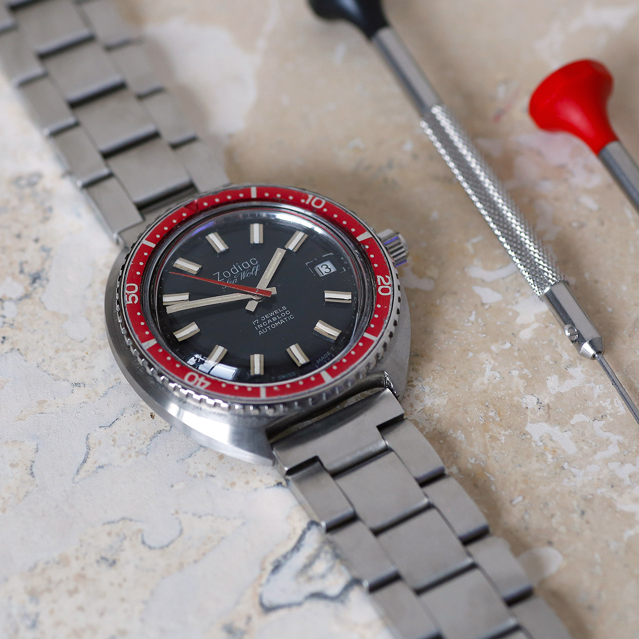 Introducing the 1970s Zodiac Seawolf 86404 dive watch, featuring a Zodiac ETA 2783 movement and automatic winding. With a striking red bezel, chunky hour markers, and a date window at 3 o’clock, this stainless steel timepiece is a vintage gem. Fully restored and signed throughout, it comes with our hassle-free warranty for added peace of mind.