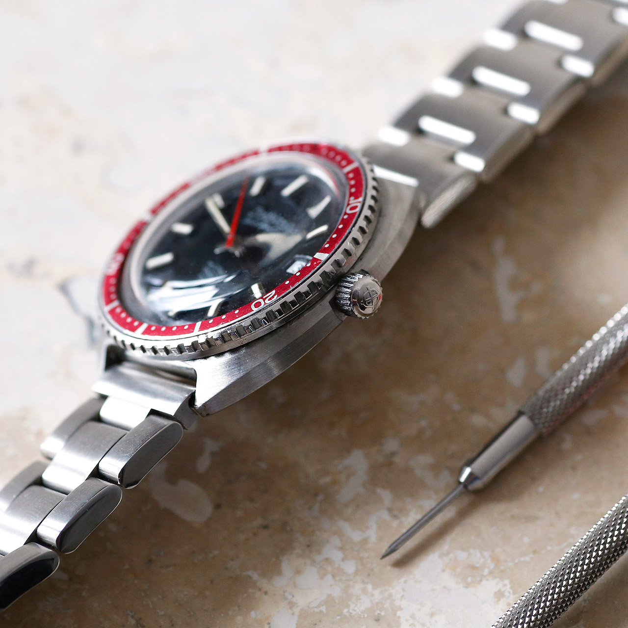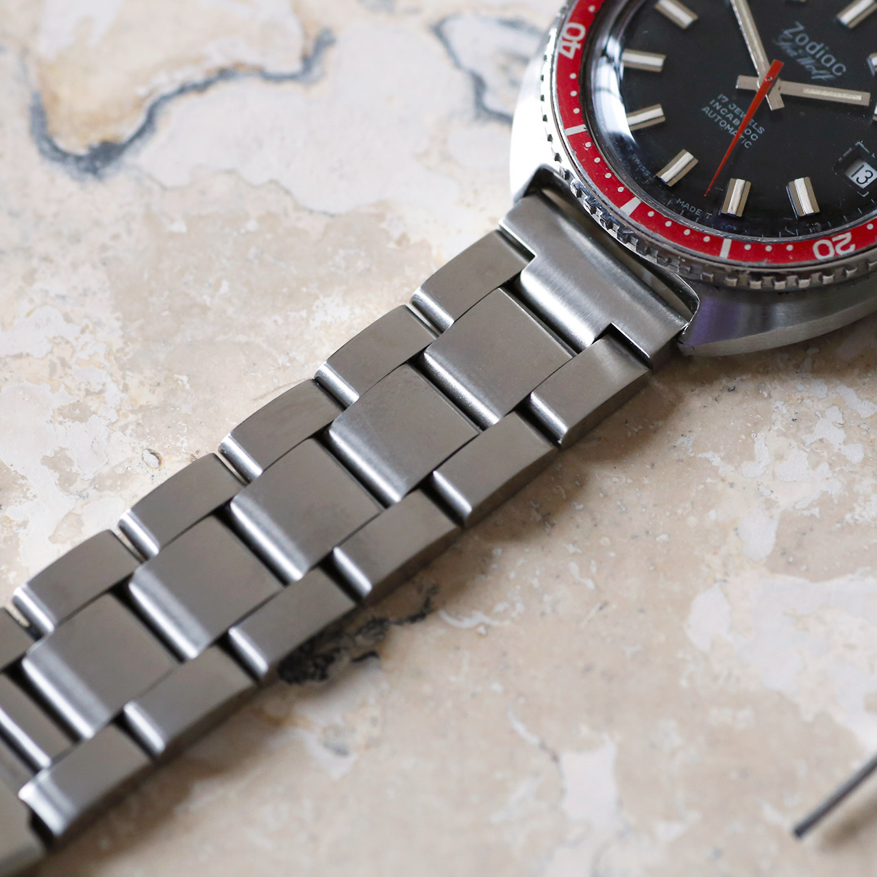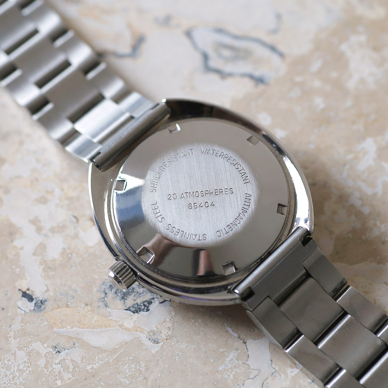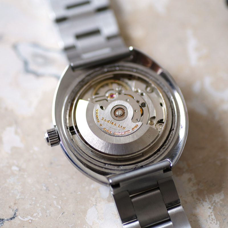 Crafted with precision and attention to detail, the 1970s Zodiac Seawolf 86404 features a host of impressive elements, including a date window at 3 o’clock with quickset, a screw-down diving crown, and an armored dive crystal for enhanced durability. The sold stainless steel bracelet adds a touch of sophistication, while the case – refinished in OEM style – showcases the intricate craftsmanship that sets this timepiece apart.