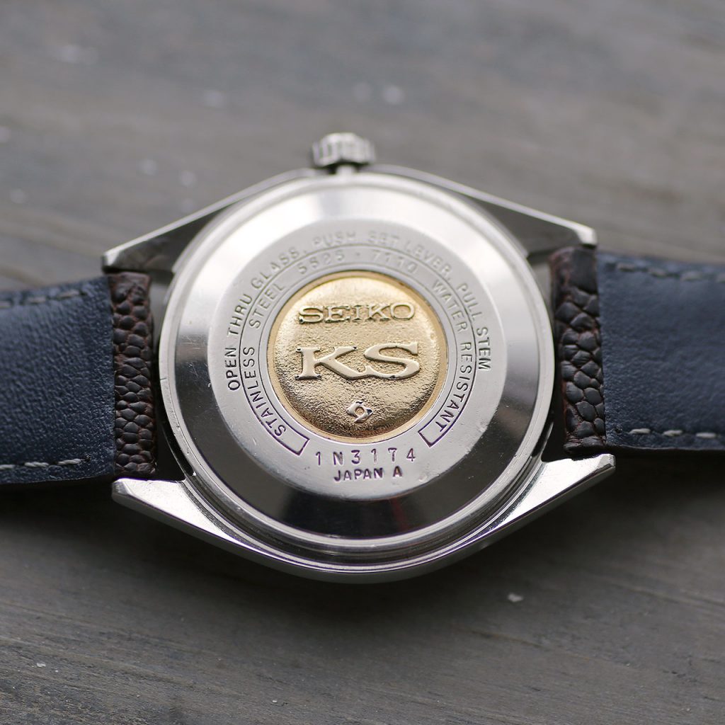 This King Seiko Hi-Beat features the King Seiko 5626 automatic movement with day and date. The Day can be selected by the wearer to appear in either English or Kanji (as shown). The watch runs at 28,800 vph, which in 1971, was considered a very high beat rate. The movement featured in this watch comes from an era when Japanese movements were starting to beat out many Swiss manufacturers in accuracy competitions, making it an interesting piece of history. There is a gold King Seiko medallion featured on the caseback that sits against your skin when you wear it.