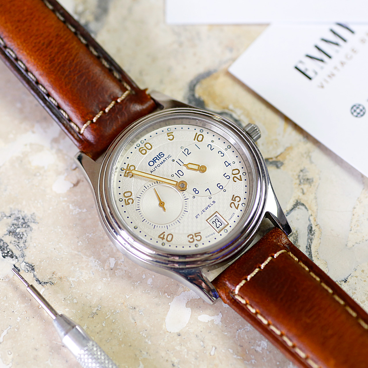 EmmyWatch ensures that every detail is meticulously attended to, from the new sapphire crystal to the high-end stitched leather strap with an Oris buckle. Enjoy the convenience of a quickset date feature and the ease of reading the time at a glance with this exceptional timepiece. Backed by EmmyWatch’s zero headache warranty, this Oris Regulator 7473 is not just a watch—it’s a work of art that transcends time and style. Own a piece of horological history with this vintage Oris masterpiece, available exclusively at EmmyWatch, where luxury vintage watch restorations come to life.