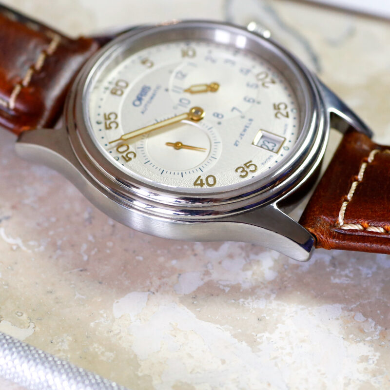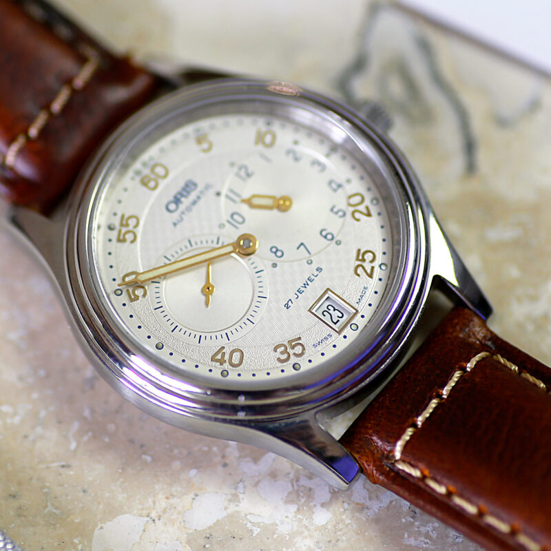 Introducing the exquisite 1990s Oris Regulator 7473 wrist watch, featuring a unique time-telling design with separate hands for seconds, hours, and minutes on a stunning original dial. Restored to perfection, this automatic watch boasts an Oris 649 movement with quickset date and a triple-tiered bezel design, all elegantly presented in a 35.5mm case on a new high-end leather strap. Don’t miss the opportunity to own this near-new old stock timepiece, backed by EmmyWatch’s zero headache warranty.